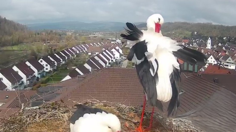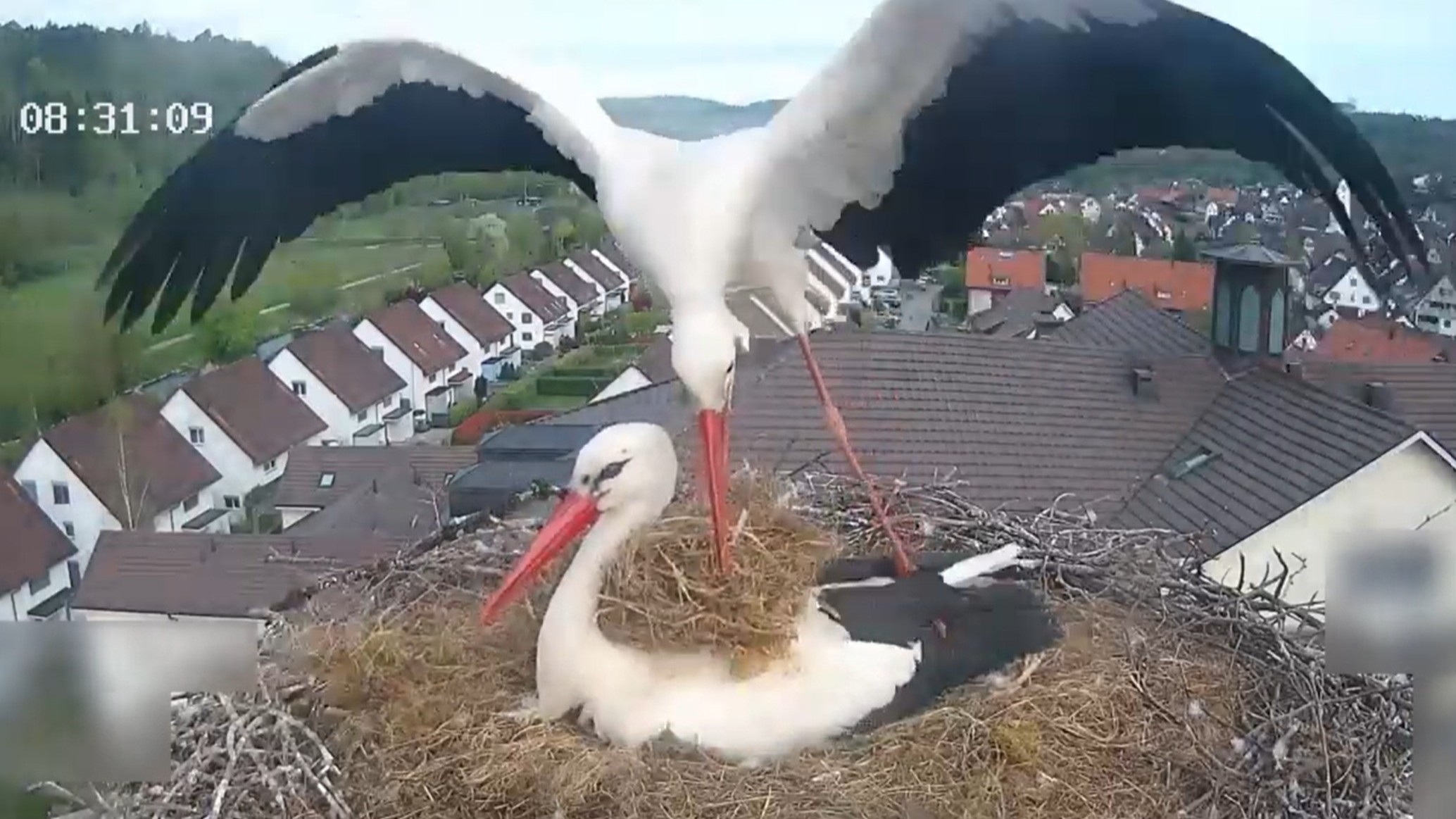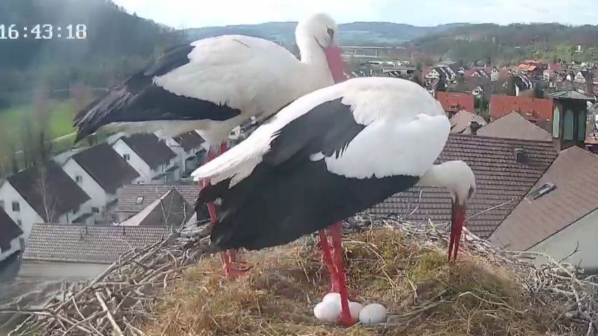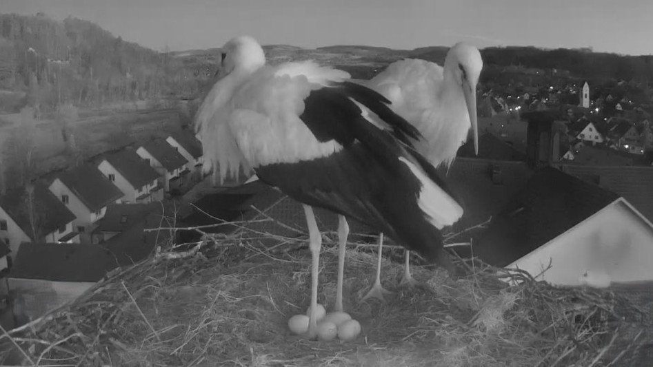 Mittwoch, 8.4.2026 - In der Nacht auf Dienstag hat Störchin Judith um 02:18 Uhr ihr fünftes Ei gelegt.
